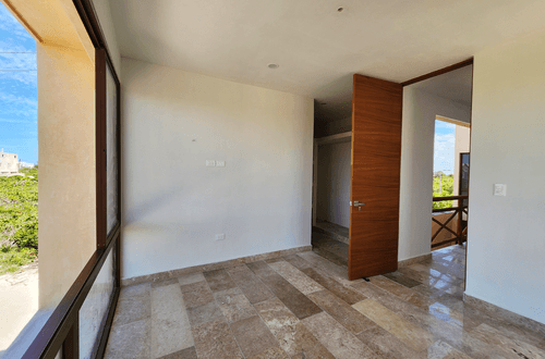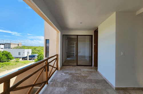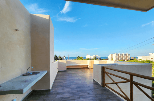 Amplia terraza con barandal de madera tipo bajareque con vista al área de la alberca