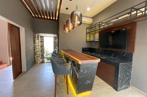 Bar interior con ventanas que permiten la entrada de luz natural y ofrecen vistas del entorno
